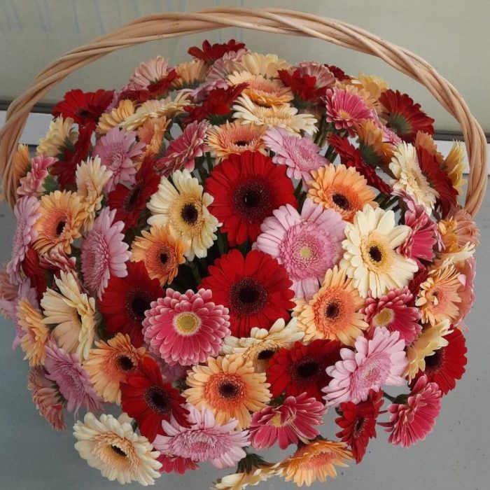 Гербера мини – 101 шт.Корзина плетеная – 1 шт.Оазис флористический – 3 шт.