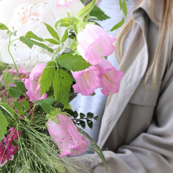 Пион – 3 шт.Колокольчик – 2 шт.Ромашка – 3 шт.Астра – 2 шт.львиный – 3 шт.Маттиола – 2 шт.Ахиллея – 2 шт.Паникум – 3 шт.Ветки малины – 4 шт.Фисташка – 2 шт.Лента атласная – 1 шт.