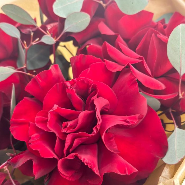 Эвкалипт – 1 шт.Лента атласная – 1 шт.Тишью – 3 шт.Роза Эксплорер – 5 шт.упаковка зефирка – 3 шт.