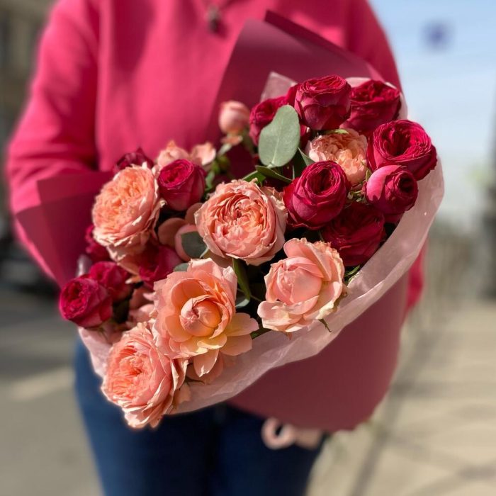 Эвкалипт – 3 шт.Роза кустовая пионовидная – 5 шт.Упаковка дизайнерская – 1 шт.