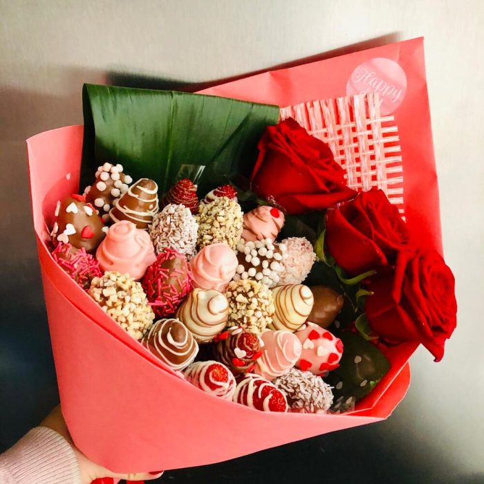 Аспидистра – 1 шт.Роза – 3 шт.Упаковка дизайнерская – 1 шт.Клубника в шоколаде – 500 гр.