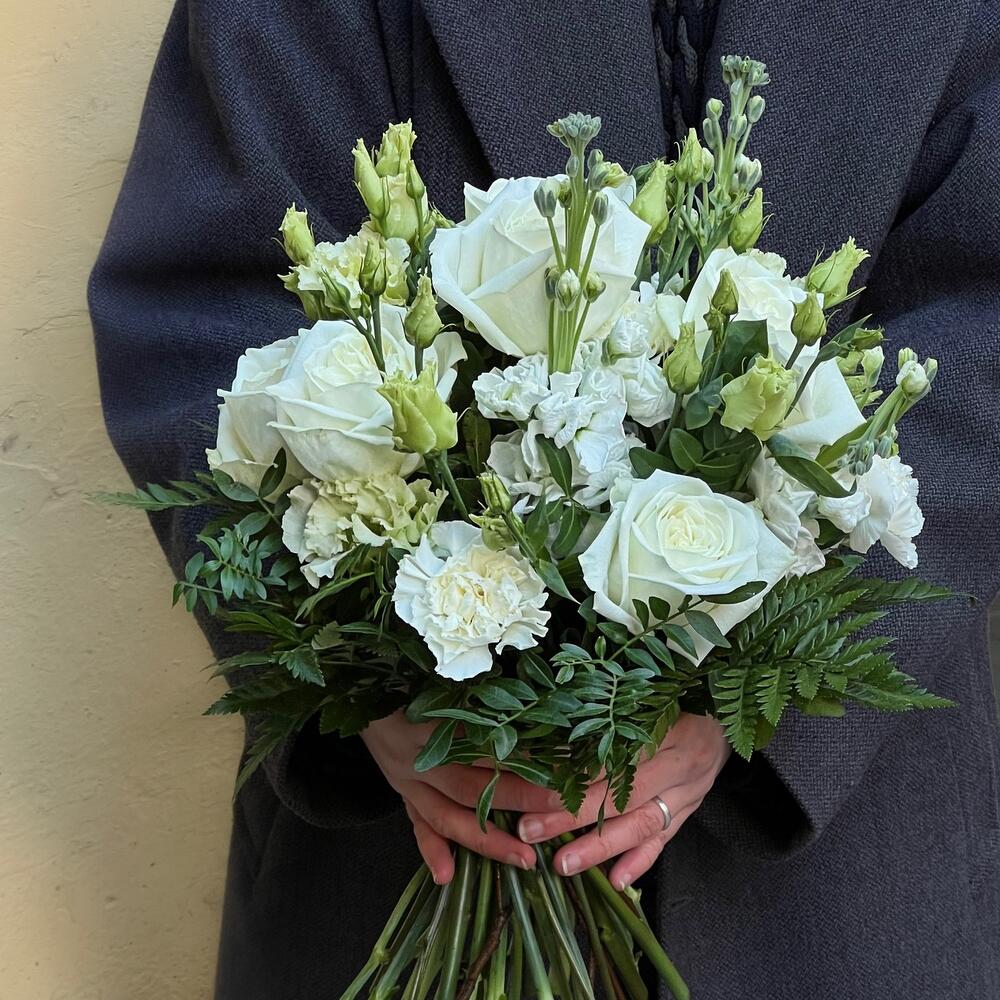 Лизиантус – 3 шт.Маттиола – 3 шт.Папоротник – 2 шт.Гвоздика – 8 шт.Фисташка – 4 шт.роза плая бланка – 7 шт.