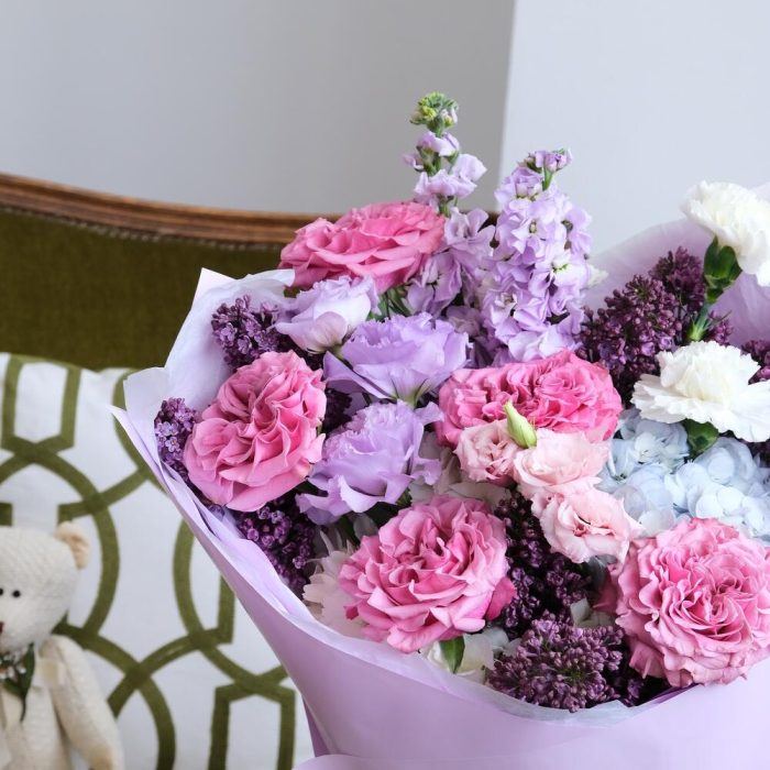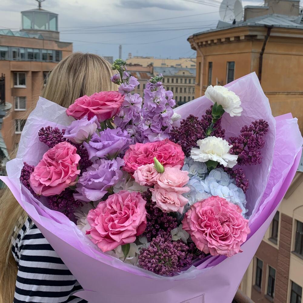 Лизиантус – 2 шт.Сирень – 5 шт.Гвоздика – 3 шт.Гортензия белая – 1 шт.Упаковка дизайнерская – 2 шт.Гортензия голубая – 1 шт.маттиола сиреневая – 2 шт.кантри блю пионовидная роза – 5 шт.